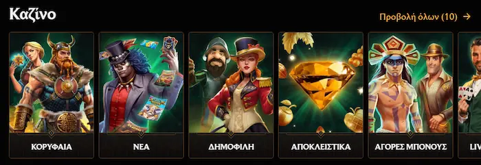 Δημοφιλείς τίτλοι περιλαμβάνουν το Gates of Olympus, Sweet Bonanza, Book of Dead, Big Bass Vegas Double Down Deluxe και Sakura Fortune. Η ενότητα "Bonus Buy" επιτρέπει στους παίκτες να αγοράσουν απευθείας πρόσβαση στα μπόνους παιχνίδια, παρέχοντας γρήγορη δράση.